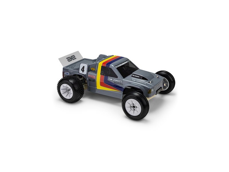 JConcepts has re-created the classic stadium truck body used during the release of the RC10T at the 1991 Winter Championships in Lutz, Florida. The debut came on the truck that blistered the track and took the overall championship that weekend. The original styled design is wide and carries a unique look, fit, and includes a spoiler look that is secured to the tailgate area giving it a tremendous racing look.